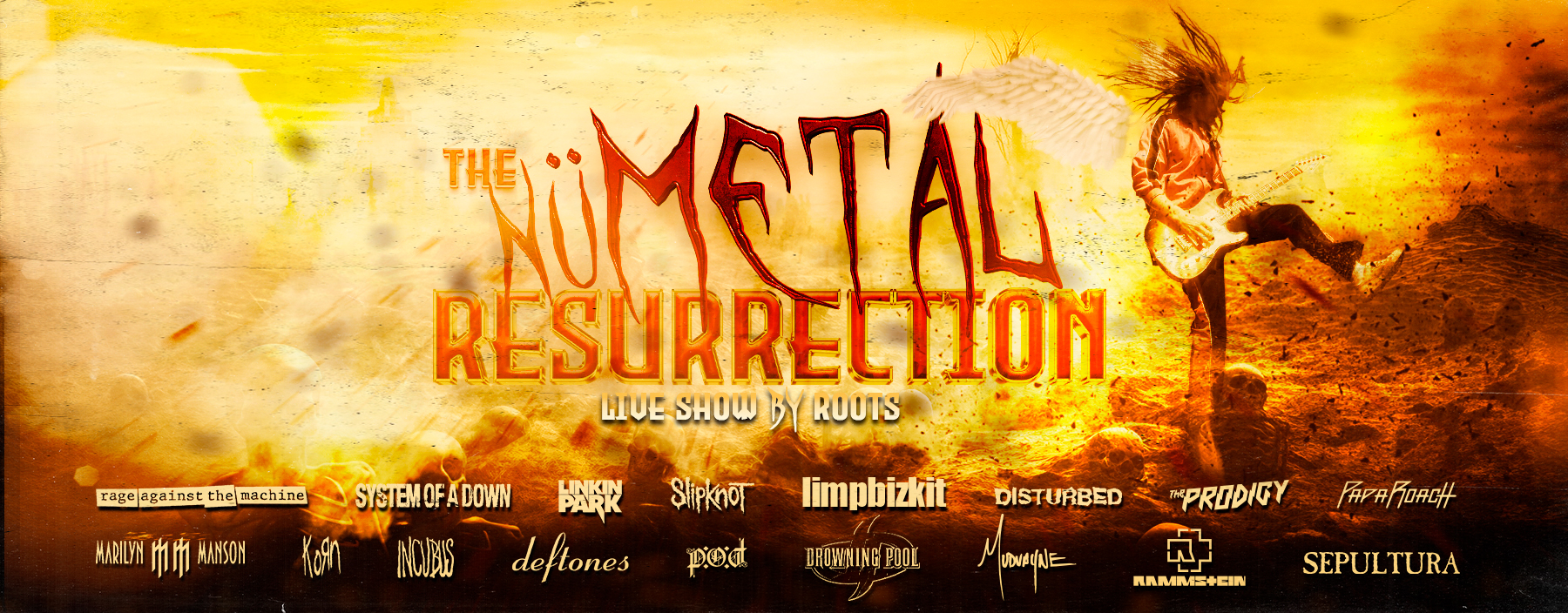 THE NU METAL RESURRECTION [LIVE SHOW BY ROOTS®] es un un increíble espectáculo con música en directo, iluminación, puesta en escena, imágenes y narrativa que nos irá guiando a través de la historia de los grandes artistas del Nü-Metal como Linkin Park, Korn, System of a Down, Rage Against the Machine, Limpbizkit o Slipknot, entre otros.